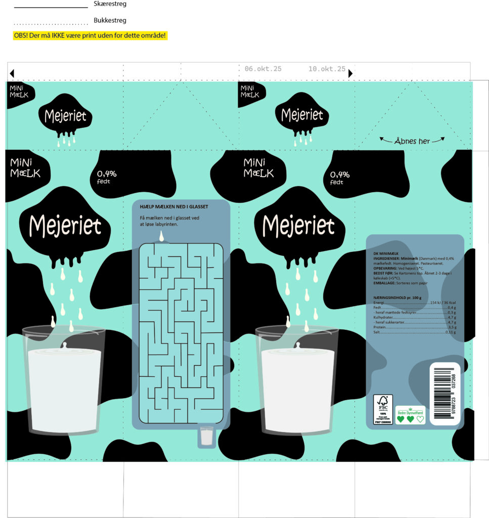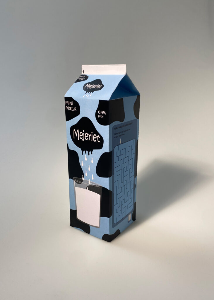 Et skoleprojekt med fokus på design af emballage og udvikling af logo. Udgangspunktet var “Mejeriet”, som vi skulle udvikle ny emballage til. Nedenunder ses stanseformen inden den blev trykt, samt mockup og det færdige produkt.