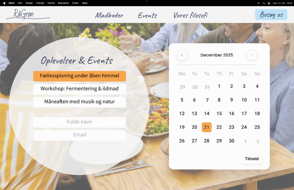 Opgaven lød på at designe et website mockup på Figma, af et fiktivt streetfood koncept. Jeg tog udgangspunkt i den nordiske og rolige stil som Banegaarden repræsentere. Konceptet kaldte jeg for RåGrøn, og du kan se min mockuop her: RåGrøn